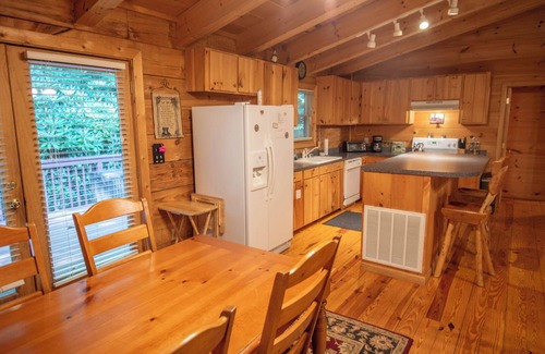 Bear's Den is a true log cabin, with wood walls and beamed ceilings. Its inviting open floorplan facilitates entertainment and family togetherness. You'll love the leather furniture, large stone fireplace and well-equipped kitchen, designed to make you feel at home. Off the great room you'll find two spacious bedroom suites, with queen-size beds and their own bathrooms. Each bath offers a Jacuzzi soaking tub and separate walk-in shower.