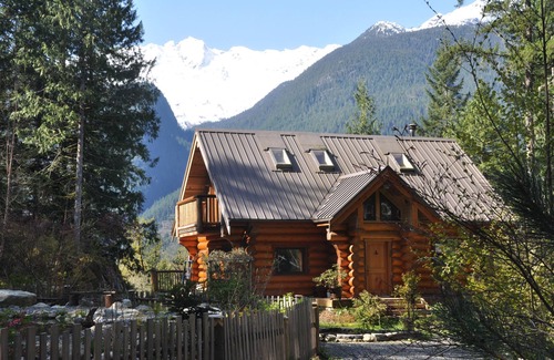 If you want privacy, serenity, a private natural swimming pond, and an awe-inspiring view of a glacier, then you will feel right at home at this log house in the picturesque Squamish River valley. The Squamish River valley is off the beaten path between Vancouver and Whistler, with only about one hour to Vancouver and 45 minutes to Whistler. The valley is a broad, sunny oasis of lush cottonwood and alders in the flat valley bottom surrounded by steep slopes covered by ancient cedar, hemlock and fir. The mountains precipitously rise over 8000 feet to culminate in snow and ice-clad peaks of the Tantalus Range.