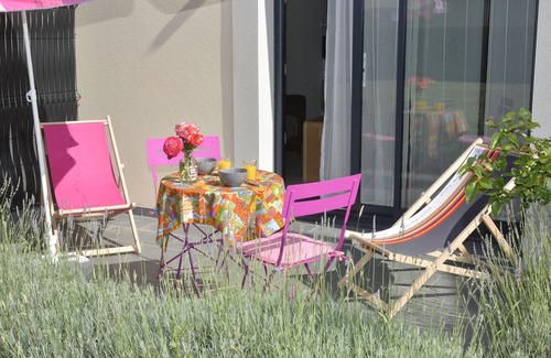 private terrace, garden. Directly south. Bed made on arrival. Additional facilities on request (Relax, bike, BBQ, cot)