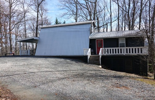 As you enter the cabin from the front deck entrance, our cozy living room/dining room welcome you with comfy chairs and country décor. The eat-in kitchen has everything you will need to prepare meals and all you need to bring is your desired foods. There is a FREE washer and drier with "starter" cleaning and laundry supplies. But feel free to bring your own. There is one bedroom and a full bath on the ground floor with 2 bedrooms and a full bath on the second floor. The attached and covered porch and deck has seating and a café-sized tables and an outside charcoal grill. There is a loveseat swing located in the yard facing west to view the sunsets. Our fire pit is down the small graveled path off the porch. The shared, gravel driveway has ample parking for multiple vehicles, even motorcycles! We have a supply of kickstand pads available. If you plan on parking your motorcycle on the covered concrete patio please bring something to prevent oil leaking onto the concrete..