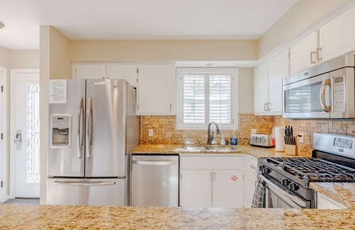 2 Bedroom (King and Queen beds with individual ensuite)/2.5 baths/Queen size pull out Sofa/1600 Sq Ft. Totally updated and fully equipped kitchen with stainless steel appliances, granite counter and tile backsplash, tile floors down stairs and hardwood up, linens and towels provided. Full size washer and dryer also in unit, flat screen TVs in each room with many channels including HBO, and a smart TV in the living room so bring your Netflix password. Free (strong!) WiFi throughout the unit.