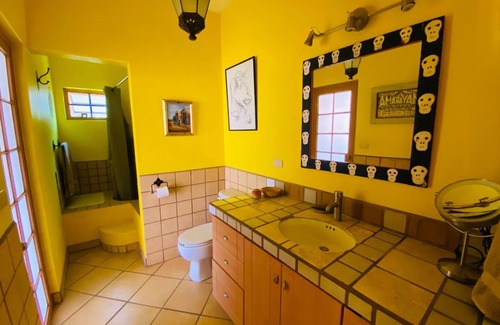 This thick walled and brightly colored Mexican home is a delight in the middle of Central Ajijic, with easy walking distance to the lake front, great restaurants, the central square and many local activities. Cool in the summer with a fireplace for cooler months creates the perfect climate for year round living. This two story house is rented as one unit or two separate units. (See Listing 2780366 for information on the Downstairs Unit) There is internet, local phone, and TV. Completely furnished and outfitted for you to move in and enjoy. The master bedroom is colorful with an AC and a large walk-in closet and a unique curved tile tub/shower in the complete bath. The bedroom is separated from the Kitchen/Lounge by a spacious and airy covered deck extending virtually the entire upper floor. The covered deck has a central 6 person open air dining table, plus a separate seating area for casual conversation/morning coffee – all with view of the central courtyard below. The small but complete Kitchen is fully equipped and adjoins the TV lounge area which has a futon couch for overnight guests.