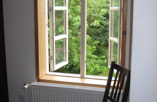 This 100 sqm. large apartment upstairs can accommodate up to 5 people. In the former servant's room facing south there is a beautiful living room with television, sitting area (sofa bed) and access to the large balcony (2.5 x 3.5 m.) From the living room you can also access the 1st Bedroom (with french bed). To the east is another large living room with 2 single beds, which can also be used as a double bed. Here you have a wonderful view over the house paddock into the wide landscape. The large, fully equipped kitchen with dining area, dishwasher, electric stove and oven is most beautiful in the afternoon and evening; we recommend the sundowner in the sunset ... A highlight is the particularly spacious, bright bathroom, in which you can not only take a shower, but also lie in the tub and immerse yourself in the Nordic sky.