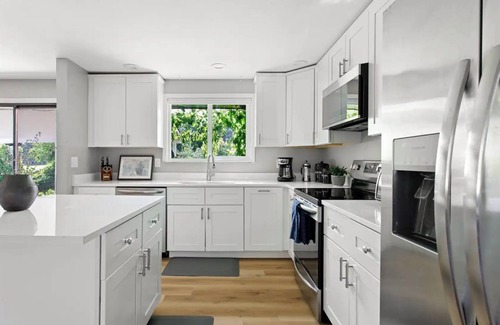 This recently remodeled home boasts four bedrooms as well as a full kitchen, den with fireplace, dining room and living room with new modern furniture. There is a basement equipped with a game room with ping pong table and arcade system featuring 18,000 games from the 80's, 90's and 2000's. There is also a gym with rower and treadmill, and movie theater room for added entertainment and to keep yourself in shape on an extended stay.