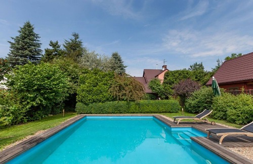 Lubogoszcz 3 km from Sława: Beautiful, comfortable 2-family house "Nad Jeziorem Sławskim", built in 1996, renovated in 2018. On the outskirts, in a quiet, sunny position, along the wooded area, 300 m from the lake, in the countryside. For shared use: property 1'400 m2 (fenced), garden, swimming pool (5 x 10 m, seasonal availability: 20.May. - 01.Oct.). Boccia, garden furniture, barbecue (sandbox). In the house: internet access, trampoline, central heating system, air conditioning, burglar alarm system. Available: bicycles, canoe, sledges. Parking (for 3 cars) at the house. Shop 3 km, grocery 3 km, supermarket 3 km, restaurant 3 km, bus stop, swimming bay 300 m, lake Sławskie 300 m. Tennis 2 km, riding stable 5 km, children's playground 200 m. Please note: The owner does not accept any youth groups. Fishing [permit required]. Additional accommodations can be booked. Property ref. PL6743.1.1-2 is situated on the same property. Kayaks (extra). Treehouse for common use.