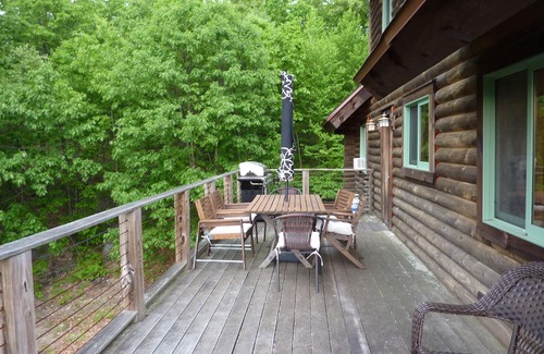The house is privately nestled on 8 wooded acres, with full views of the Catskill mountains. Open floor plan with 24’ cathedral ceiling, modern appliances, four bedrooms (2 with en suite baths) located on 3 floors, three bathrooms (1 with Jacuzzi bathtub, 1 with modern soaking tub), separate TV room with 42' 1080 flat screen TV, wraparound deck with gas grill, herb garden and lawn chairs with fire pit, and separate lounging deck on private ridge.
