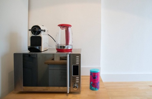 The living room is bright thanks to its large windows overlooking the street, yet quiet. You'll enjoy an HD TV, a sofa bed that can accommodate two people, and a lovely alcove (which can be closed) with a comfortable 140x190 double bed and a large adjoining walk-in closet to store your clothes.