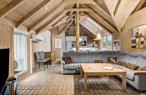 Your holiday in Slettestrand will be a relaxing experience surrounded by beautiful nature and modern comfort. This stylish wooden holiday home offers plenty of space for the whole family and impresses with its open-plan design with high wooden ceilings and a spacious outdoor area. Start the day in a relaxed way with a hot cup of coffee. You can cook together in the modern, well-equipped kitchen, while the open-plan dining area is ideal for cosy get-togethers.