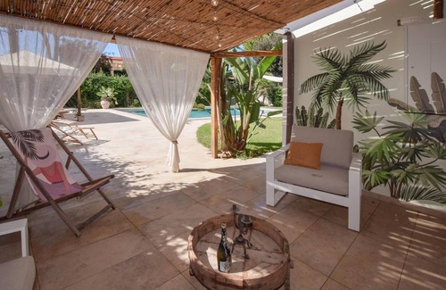 The paradisiacal outdoor area offers pure relaxation. The large pool with sun loungers and parasols invites you to sunbathe and relax. Spend unforgettable hours in the stylish lounge corner on the terrace and enjoy a glass of wine in good company. Prepare local delicacies in the outdoor kitchen with barbecue and experience Mediterranean joie de vivre from morning to night.