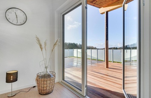 This extra large vacation home offers the optimal setting for a successful vacation with many guests and in comfortable surroundings. The house is located on an open natural plot with views of the countryside and plenty of space to play and be active. The high-quality vacation home is equipped with all the amenities you could wish for a vacation. Inside, you can expect a bright and modern atmosphere with furnishings in an elegant Scandinavian style. The heart of the house is the open living and kitchen area, where you can meet with family or friends. Spend relaxing TV evenings, sociable meals or exciting game nights together. Beautiful daylight falls through the large windows.