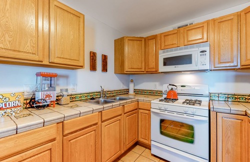The impressive Great Room features vaulted ceilings and a massive floor-to-ceiling, wood-burning fireplace. Watch a movie on the smart TV or simply take in the stunning mountain views through the picture windows. A second living area continues the views and is appointed with a full-size sofa bed and a smart TV. The immaculate kitchen is equipped with a full suite of stainless steel appliances, ample cookware, and a kitchen bar. Share these meals and conversations at the adjacent dining area. A second kitchen provides even more room for prepping amazing dishes.