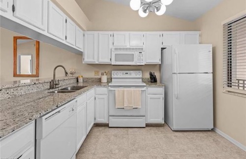 This end unit has lots of natural light with cathedral ceilings and large windows. Screened in Lanai overlooking rear of the property and pool. Newer granite countertops in kitchen-bathrooms, newer mattresses, newer furniture in living room and dining. A new floor in the living room, plus a large flat screen tv. You are close to Naples beaches, downtown 5th Ave with fabulous shopping-restaurants, and Marco Island. The pool is only steps from your building. Carport parking with extra spaces available. Small storage unit for bikes, golf clubs, also includes two beach chairs and umbrella. The rental does not include activities in Lely Resort.