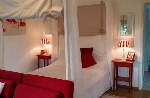 Our small, exquisitely furnished holiday flat for one to two people, which is attached to our detached house like a granny flat, is located in a very quiet residential area. We have furnished it with much love. Peace and relaxation are included thanks to the romantic four-poster bed, a cosy dining area and a sofa with a view of the small dragonfly pond.