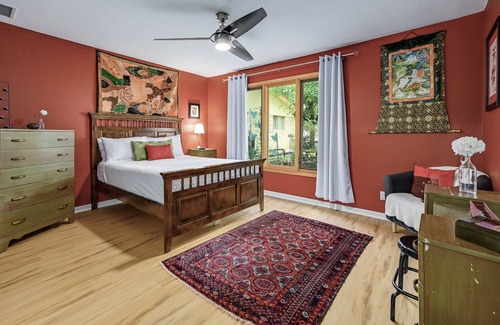 The property hosts a large, connected, multiunit home. Your unit includes a kitchen, living room, three bedrooms, bathroom, and a shared 1/2 acre backyard and creek. Each room is beautiful with new queen-sized beds, desks, and sitting areas. PETS ONLY PERMITTED FOR 30 DAY OR MORE BOOKINGS :)