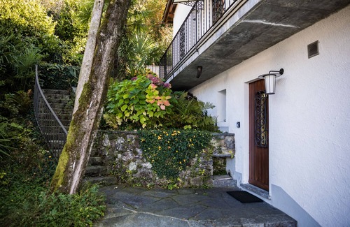 The 30 square meter studio apartment is located on the ground floor of Casa Maria, a holiday home with 2 residential units, unique location with a magnificent view of the lake and mountains, 150m above Lake Maggiore, garden seating area of 12 square meters, large well-tended garden. Very quiet location with southern flair, well-equipped kitchen, toilet, shower, a parking space is available, a long staircase leads to the apartment. Ideal for a couple looking for peace, nature and relaxation.