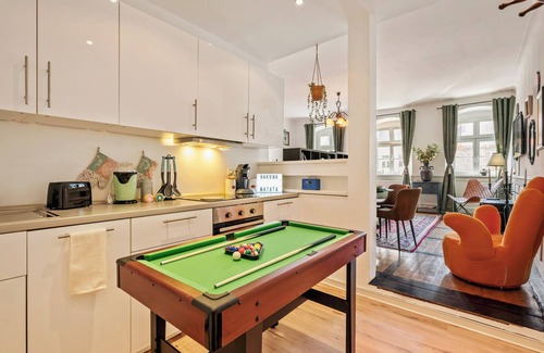 The kitchen is equipped with an oven, a stovetop, and a refrigerator, as well as a coffee maker, an electric kettle, and cookware. Try your hand at billiards, or enjoy the WiFi, TV, and music library. Bathroom amenities include a hair dryer, towels, and toilet paper. And there's access to laundry facilities, so you can even pack a bit lighter. Other amenities at this 1-bedroom, 1-bathroom rental include bed sheets, an ironing board, heating, and a dining table.