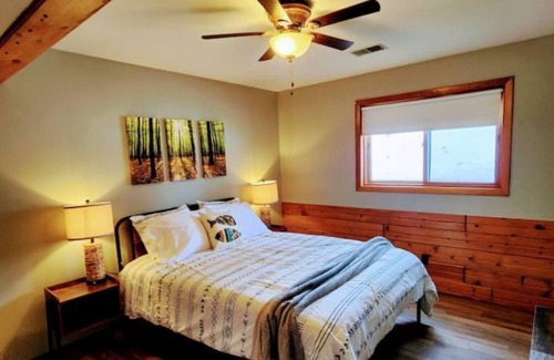 The Lodge has space for the whole family including two comfortable seating areas for games and movies, a large fully equipped kitchen with a custom farmhouse table, three cozy queen bedrooms, a huge bunkhouse with second TV and games that sleeps 8, and extra bedroom with pop-up trundle. Perfect for kids and teens! Weight limit for top Bunks and pop up trundles is 250 lbs.