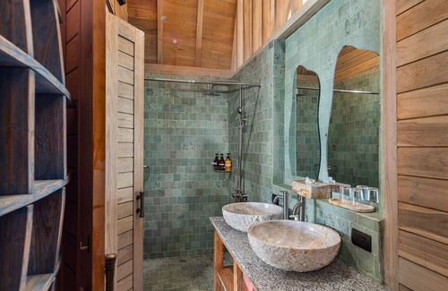 The loft serves as the bedroom with a king-size bed and an oversized backlit Mandala. An ensuite bathroom with shower, toilet, and double sinks adds comfort during your stay. Each Lumbung has a private veranda with its own entrance. A double size sofa bed allows additional persons to stay (extra charge per person).