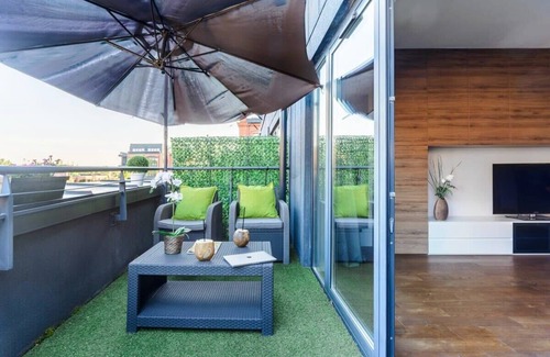 Modern apartment located in Scheibler's Lofts. Next to the apartment complex there is a small park, which will surely appeal to guests traveling with pets. The apartment consists of a spacious living room, bedroom, the huge tarace, also the bathroom. Nearby is Piotrkowska street where you can relax in cozy places and just enjoy the colors of the city.