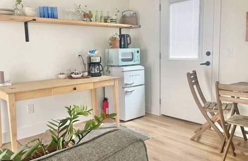 This super stylish, newly built home is just 3 minutes from the airport—hello, convenience! With free parking at your doorstep, coming and going is a breeze. You’ll find cozy vibes, comfy furniture, and a kitchenette ready for snack attacks or light meals. Whether you're catching a flight, exploring Austin, or just need a quick, comfy spot to crash—this place has you covered. Easy, cute, and perfectly located for your getaway!