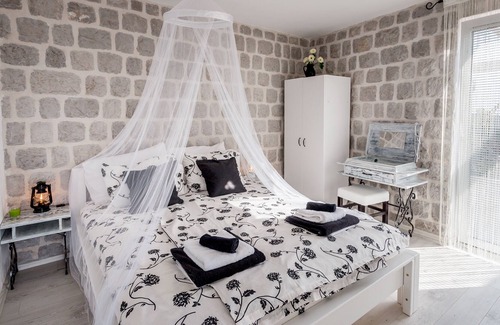Apartment Lustica Exklusiv is located in an old stone house, renovated in 2017 in the Mediterranean style and is a combination of old and new furnishings.The apartment has two bedrooms, size 50 sqm plus 30 sqm terraces. In the second house we have two apartments and studio apartment on the ground floor and first floor.On the ground floor there is one bedroom apartment, size 70 sqm plus 25 sqm terraces. Also studio apartment for two persons size 25 sqm. On the first floor there are two bedrooms 80 sqm apartment with a balcony and a terrace of 50 sqm. All apartments have a separate entrance, surrounded by a large garden with olive trees and grape wine.Use of a pool of size 12 x 8 x 1.5, terrace around the pool with a furniture and baldachines , as well as a lounge bar for the guests of the apartments.Total capacity is 14 + 3 persons.All apartments have a kitchen, one bathroom, air conditioning, free WiFi,view of the open sea i and parking place on site.The lounge bar is intended for guests only, where you can eat, have breakfast, and dinner.We offer home-made products, prosciutto, cheese, olives, homemade bread, cookies, ice cream, as well as wine and juices.Lunch and dinner we organize in agreement with you, and the preparation of meat and fish domestically on fire, under the bells, grill, will make a special taste of food.In our house you can see a small museum of old things, the old olive mill, and hand-worked souvenirs.We are here for every kind of help, explanation, socializing and agreement with you for everything to make your stay so beautiful.We are located on the sunny side of the peninsula Lustica surrounded by beautiful beaches on the open sea, Zanjic, Mirista, Arza, Blue Horizons .... The cities Tivat, Kotor are 25 km away, Budva 35 km.