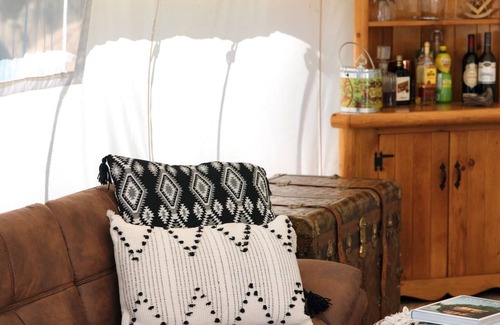 Featuring a furnished luxurious white canvas prospectors tent, complete with fireplace for staying cozy and comfortable in your king size bed. The indoor space includes a bar and pantry with mini fridge, couch, dining table and seating for 4 guests. In addition, a second sleeping arrangement can be made on a pull out futon.