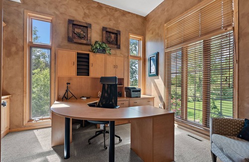 ✓ Office with desk, computer monitor, printer, and bookshelves