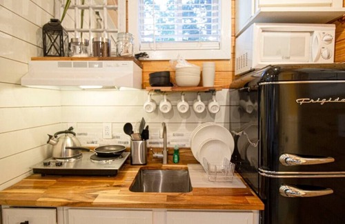 Built around trees, this home will feel cozy and peaceful. Great for couples or very small families interested in glamping type experience. Its large window will bring in lots of light and drapes will black-out space when desired.