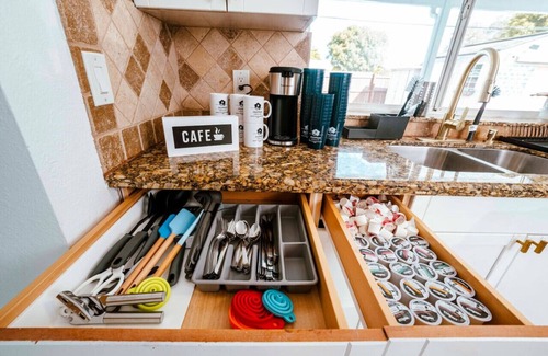 The kitchen area with numerous cooking appliances and spacious countertops is in the middle of the house. If you want to take a break from the beach restaurants, then this is the place for you.