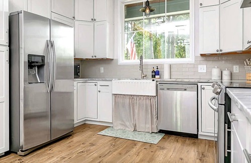 Tucked away in a quiet, secluded neighborhood but just minutes from everything, this 4-bedroom, 2-bath cottage offers the perfect blend of comfort, style, and convenience. Inside, you’ll find upscale finishes throughout, spacious living areas, and three luxurious king beds to ensure everyone sleeps in comfort. The home is designed for families and friends alike, with a backyard playset for the kids, a covered back porch for relaxing, and a grill ready for cookouts. Whether you’re in town for a weekend or a while, this home has everything you need for a comfortable and memorable stay.