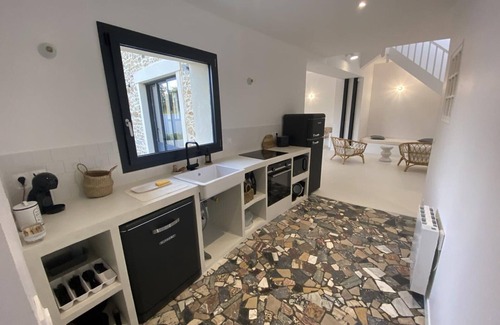On the ground floor: equipped kitchen (dishwasher, fridge-freezer, oven, microwave, induction hob, single-serve coffee maker). Bathroom: shower (150x90) and sink. Bright, 50 m² living room with contemporary decor (105 cm TV). Electric fireplace. Separate toilet.