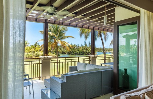 The comfortable and relaxed open plan living area has plenty of space to relax and enjoy the view of the 8th hole, lake and coconut plantation. The French doors provide access to a large terrace where you may enjoy spending time having breakfast, lounging or napping in the afternoon, or having cocktails while watching the Caribbean sunset.