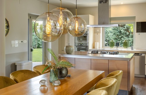 An open plan designed kitchen, air-conditioning, dining table (8 persons), gas stove/cooker 5 rings, oven, steamer/microwave, dishwasher, American fridge with ice maker, drinking water filter and 170 l freezer, kettle, toaster, blender, juicer, coffee machine (filter coffee machine, Senseo coffee pad machine, Nespresso machine and a separate milk frother), ample crockery, cutlery and cooking accessories