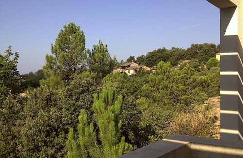 Nearby Nyons. A few steps away from the medieval town of Rousset-les-Vignes, but lost in the middle of vineyards, this designed villa is hidden into the wild nature, on a 4800 m2 undulating ground planted with pines trees and live oak. Full south facing, infinity pool of 13 m with a paddling pool for children, bordered with red cedar beaches. Large bay windows enlighten the cathedral living room and the library. Going west, you will enjoy meals on another terrace made of cedar, connected with the super kitchen equipped with a Boffi hob, refrigerator, freezer, washer, washing machines, built in oven. Upstairs: terrace of the main room, 180º view between the Ventoux and the Cevennes (130 kms). The children'sfriends' bedroom is opened on the mountain nearby. The mezzanine can welcome a double bedding. Fully tiled bathroom with azure enamels with a Roman shower, a sink and the second toilets. The gates protects your privacy.
