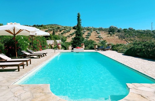 Olive's Grove villa has 4 large ensuite rooms. A swimming pool and large pool house. Several outside seating areas with night lighting and a water feature. 10/15 minute drive to the beach. Fantastic walks. Gorgeous sunsets. Large open plan living, dining and kitchen.