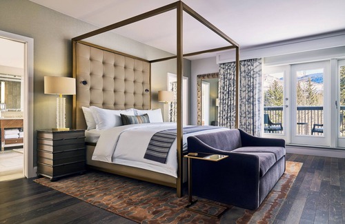 Experience a luxurious getaway in Vail when you choose our largest suite measuring 1,860 square feet. This expansive suite is appointed with three private balconies, a large living room, a dining table for eight, a primary bedroom with one king bed and a second bedroom with two queen beds.