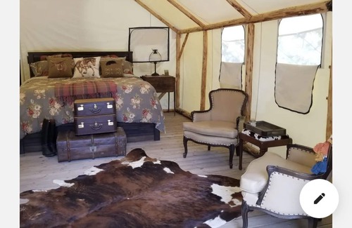 Experience the thrill of glamping outdoors with all of the amenities and luxuries of a hotel. Savor your morning coffee or evening drink on the adirondack chairs on the deck. Cuddle up in front of the wood-burning stove...enjoy the sounds of the coyotes howling from your Ralph Lauren covered king size bed. Enjoy the indoor rock & marble shower or a fabulous shower in your private outdoor shower! Enjoy complete privacy while surrounded by just under 1 million acres of National Forest.