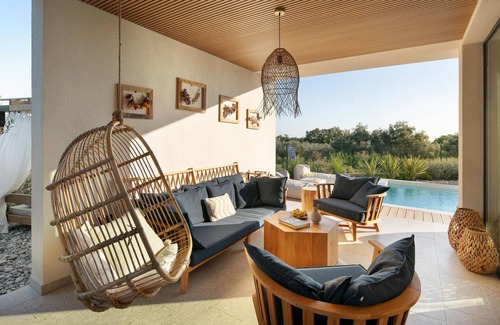 From the living room and dining room there is direct access to the outdoor terrace, which is surrounded by a beautifully landscaped garden and greenery that you will enjoy. Swimming in the 50 m2 swimming pool is just one of the benefits that villa Eco offers. The pool is 1.3 metres deep, and next to it is a sunbathing area with 4 sun loungers where you can soak up the sun and read books. Also, on the terrace there is a lounge area where you can drink your morning coffee, and there is also an outdoor gas grill. You can try the prepared food on the outdoor dining table.