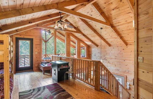 The amazing loft has a total of 4 bunk beds and is the perfect retreat for kids (or those young at heart). It features a train table & various toys as well as an old school tabletop arcade game to keep everyone entertained for hours. The kitchen is fully equipped with everything you need to prepare a wonderful family meal which can be enjoyed at the farmhouse style dining room table with room to seat everyone. As the evening winds down, the cozy and inviting living room is the perfect spot to relax. Enjoy the large flat screen TV with full cable and you can even access your Netflix, Hulu, or Pandora accounts on the Smart-Enabled BluRay DVD player. And yes, this cabin does have free WI-FI and your cell-phone should work just fine.