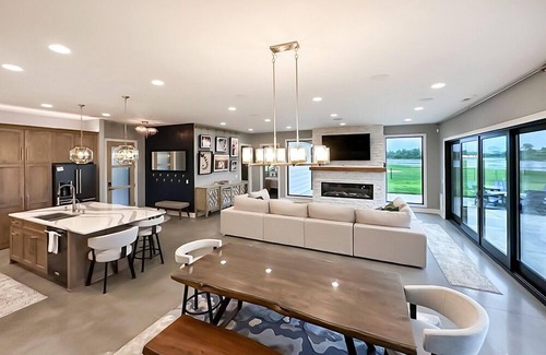 Open floor plan with kitchen, dining, & living room is one shared space. The living room features an electric fireplace (currently not working) and a large sectional. The large patio off the living room has multiple seating areas, a gas grill (one propane tank provided), fire pit (firewood provided) & a TV.
