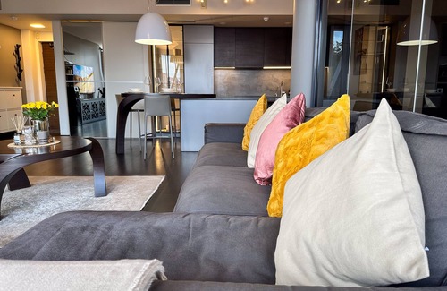 The living room features a state-of-the-art home theater system, perfect for immersive movie nights or enjoying your favorite music in high fidelity. Smart lighting throughout the apartment allows you to set the mood effortlessly, whether for a cozy evening in or a vibrant gathering with friends.