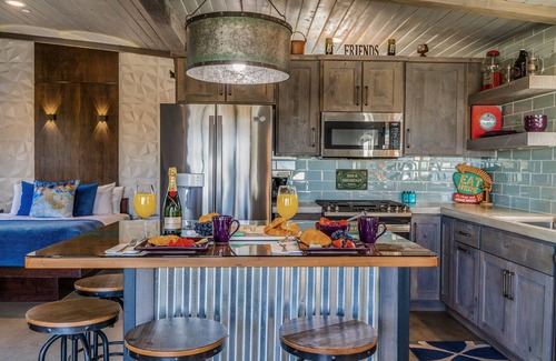 Immerse yourself in the fun and funky vibes of the Joshua Tree desert in style! Our gorgeous studio is perfectly situated on the edge of town, keeping you close to all of the shops, dining, and attractions our town has to offer. With Joshua Tree National Park less that 10 minutes away, you’re a quick drive to one of the most memorable drives / hikes.