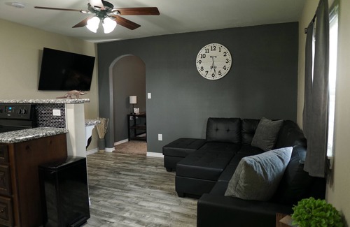 Welcome to the Luxurious Tiny House! Located a convenient 2 miles away from Phillips 66, this is a perfect place for out of town workers or someone looking for a quiet place to get away. This house has many features including a full kitchen with cooking necessities, leather sectional couch, two TVs, computer desk, queen sized bed, tiled shower with dual heads, on demand hot water heater and more!