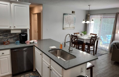You will love this home with the open floor plan with 2 bedroom and two full size bathrooms. There is a cozy fireplace in the living room and a sliding glass door in the dining area that goes out to a private patio. There are 2 full bathrooms and each bedroom has a comfy king size bed complete with a 55 inch smart TV. The home is freshly remodeled with wood flooring and the kitchen is complete with brand new stainless steel appliances and everything you need to prepare a home cooked meal. There is a one car attached garage for you use! You also have a washer and dryer in the home that come with complimentary laundry detergent.
