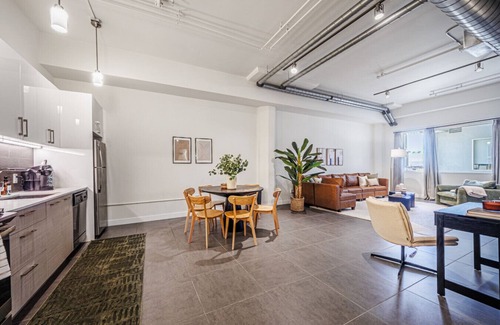 This modern 2-bedroom Downtown LA apartment highlights its industrial character with tall ceilings and exposed ductwork details. Whether you’re here for work or fun, you’ll love the mix of architecture, comfort, and unbeatable location.