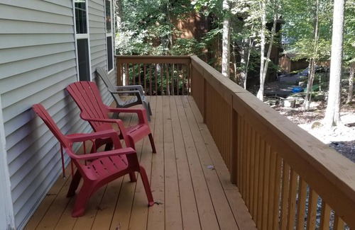 Chalet, 4 Bedroom 3 1/2 Bathroom with Basement Family Room. Sleeps 12 (max) Comfortably. Master Bedroom Has a Queen Bed and a master bathroom along with a fold up Cot and cable TV. Basement bedroom #2 has a Queen Bed along with a Day Bed and Cable TV. Bedroom #3 on 2nd Floor has a full-size bed, two twin beds and a Steaming TV. Bedroom #4 has a queen bed and a twin bed. Loft has a nice and comfortable Couch along with a TV to hook up your gaming console. Each Floor has a Bathroom. 1st Floor had a half bath with a laundry room. Living Room Has 2 Couches that sits 7 with a 55" TV with Cable. Kitchen/Dining is fully stocked with all needed to feel like home. Between Dining and Kitchen there is room to sit 11 people. The basement Family Room had room to sit an additional 12 people. The octagon table converts to a poker table and bumper pool table. There is a 46" TV with Cable and board games for the kids and a Checkers in coffee table that can be pulled out. Foosball table for the college kids at heart. There is a rear deck that can sit 12 people with a BBQ to. Front Deck has a table for 6. There is also a Fire Pit to use. (Need to bring own wood). House has Central Air and Heat. Plenty of wildlife around to view.