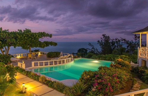 Welcome to Cliffside Cottage represented by EXCEPTIONAL VILLAS, the world's leading villa rental company on Trust Pilot. This luxury 5 bedroom private villa, is dramatically perched on a lush green hillside above the sea in Montego Bay. Cliffside Cottage commands stunning views of the deep blue Caribbean Sea by day and romantic lights that glisten across Montego Bay after sunset. Sunrise and sunset vistas from this vantage point are mesmerizing. The central part of the villa is the large living room with high rafter-and-beam ceiling. This space opens wide to a wrap-around verandah that captures the breathtaking view and refreshing tradewinds.