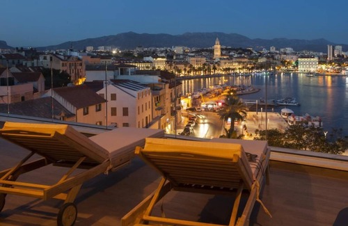 Luxury 5* penthouse in the center of Split located in the most vibrant and trendy areas in Split. Whole apartment is on the top floor of a new luxury building situated in central Split on the city's main promenade (Riva) just by the sea. Overall area of the penthouse is 300m2, with 150m2 of interior space and 150m2 of terrace. Among other attractive things within the penthouse, guests can also relax & enjoy the hot tub while watching the yachts entering the port or having panoramic views of the Old city and Diocletian’s Palace. This unit was part of few film sets and foreign sitcoms filmed in Split because of its unique position, decor and attractiveness. We are looking forward seeing you soon :)