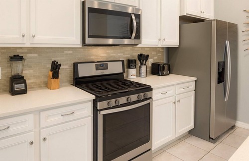 Living Spaces: Open-plan kitchen with granite counters, stainless appliances & island for 4. Dining table for 6. Main living room with Roku TV + upstairs lounge with 2nd Roku TV.
