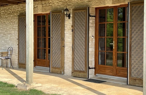 The gite located on the ground floor of our house. The French doors are facing the lake and peaceful countryside - the farmland with great views. A large covered terrasse also facing the lake for relaxing and al fresco dining with a table and chairs provided.